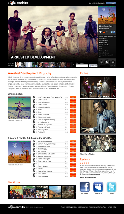We were asked to submit a design idea for the artist page of EarBits.com. Below is the design we turned around for them within 24 hours. The design includes all of the required elements the EarBits team requested as well as our own unique spin on what the page should look like and how it would function.